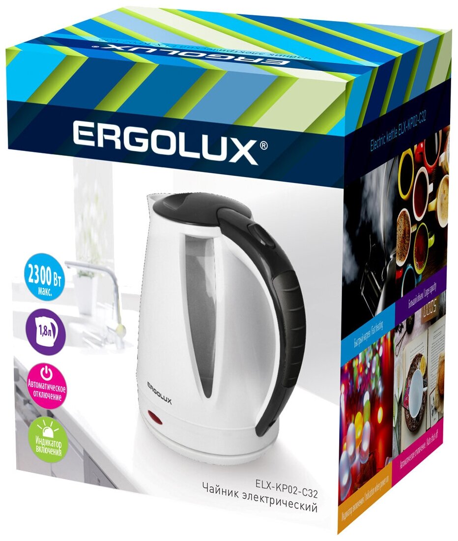 Купить Чайник пластиковый ERGOLUX ELX-KP02-C32 белый/черный, 1.8л, 160-250В, 1500-2300В