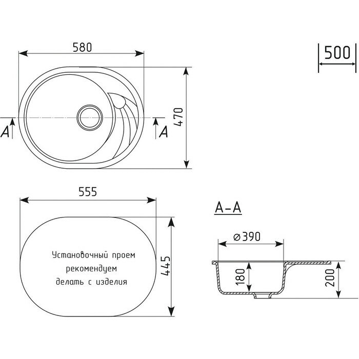 Мойка ML-GMS08 стандарт овальная с крылом, черный (308), 570*460*170мм