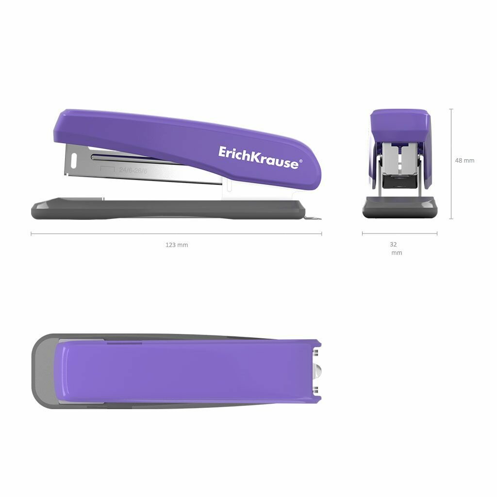 ErichKrause Степлер № 24/6, до 25 листов Quadro Classic серо-фиолетовый, антистеплер, вмещает до 80 скоб № 24/6 и до 100 скоб № 26/6, глубина закладки бумаги до 65 мм, резиновая противоскользящая вставка