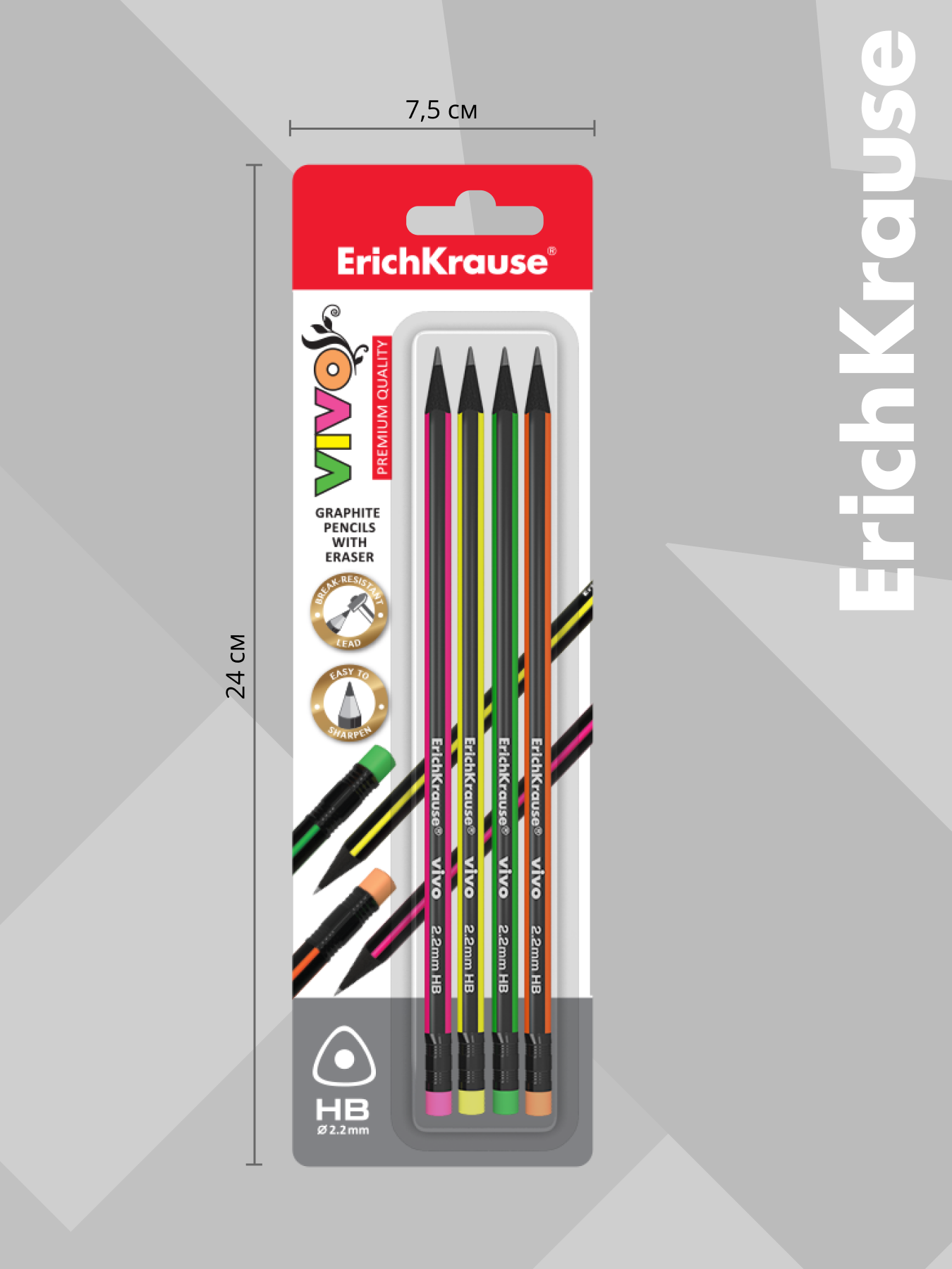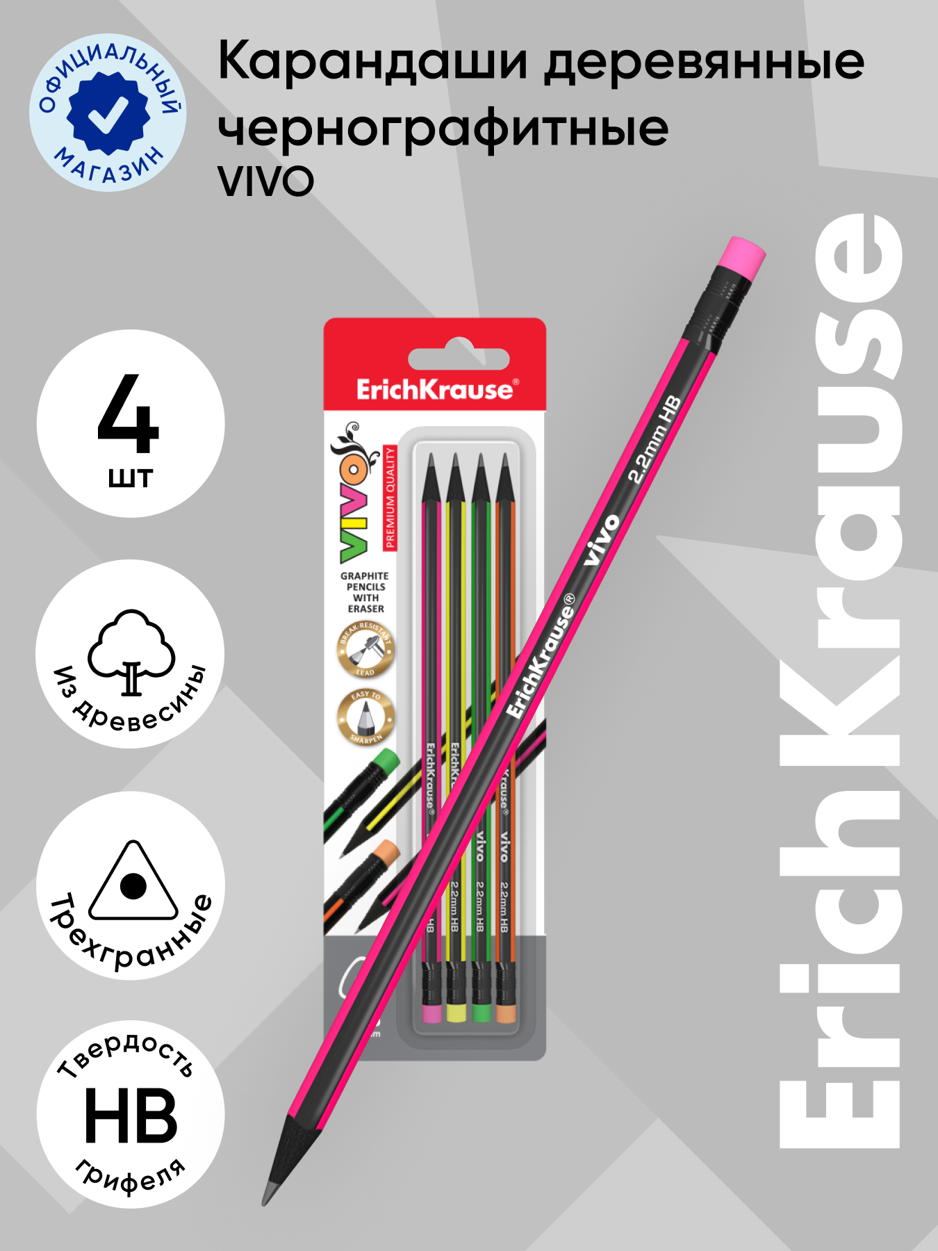 Купить Чернографитный трехгранный карандаш с ластиком ErichKrause VIVO HB (в блистере по 4 шт.)