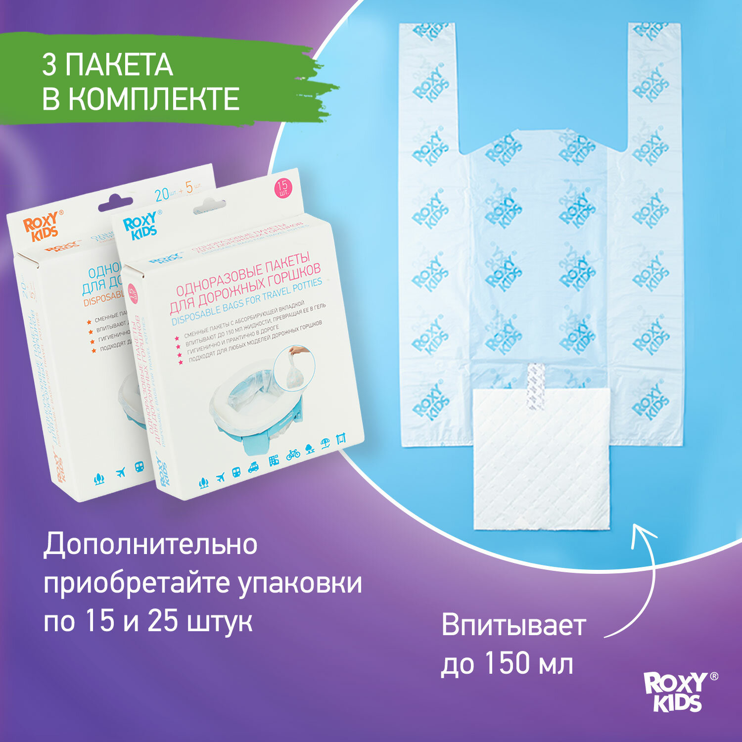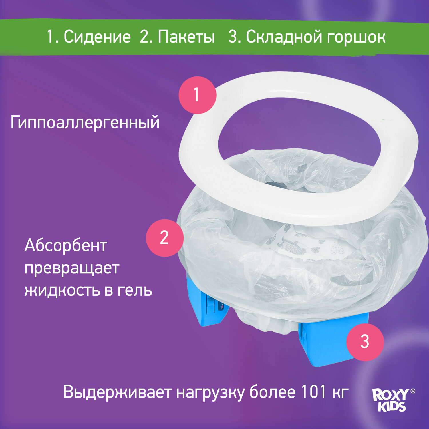 Горшок дорожный складной и насадка на унитаз HandyPotty от ROXY-KIDS с тремя пакетами, цвет фиолетовый