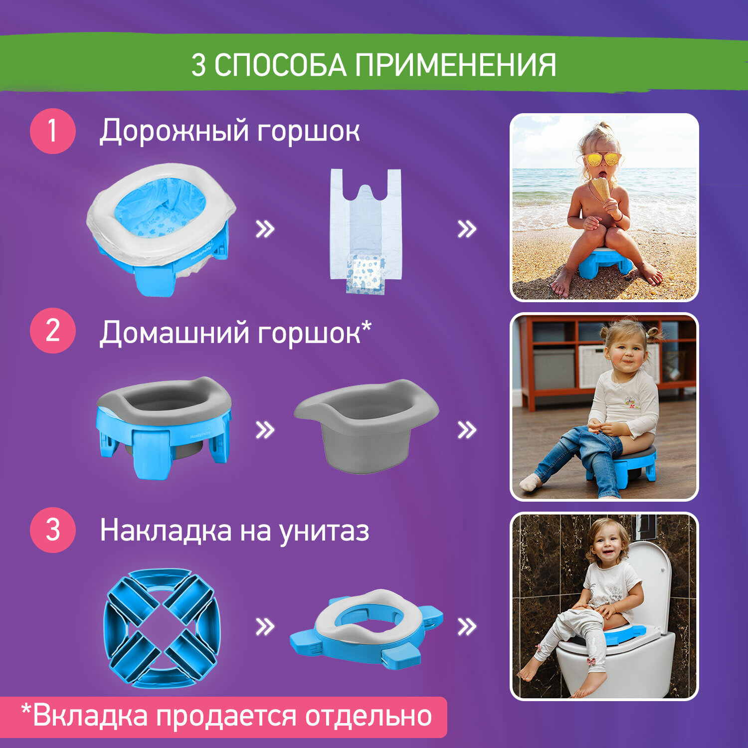 Горшок дорожный складной и насадка на унитаз Handy Potty от ROXY-KIDS с тремя пакетами, цвет фиолетовый