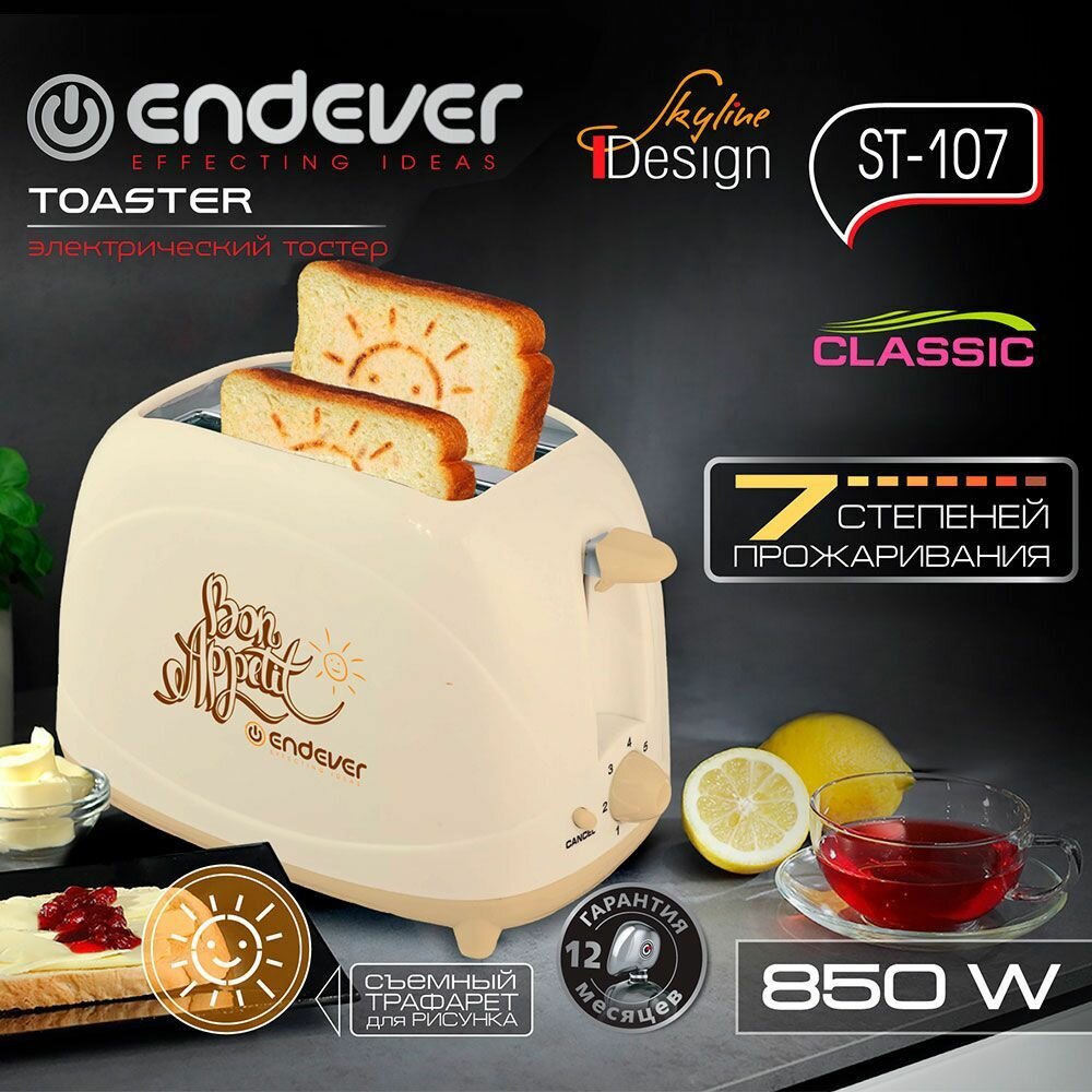 Тостер для хлеба Endever ST-107, съемный трафарет для рисунка на тосте / 7 режимов / функции отмены, центрирования / автоматический выброс тостов