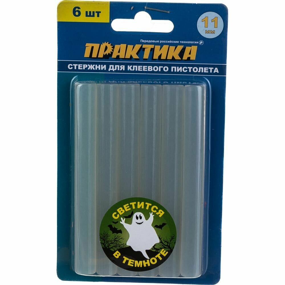 Клей для клеевого пистолета ПРАКТИКА белый, светящийся в темноте, 11 х 100 мм, 6шт / блистер