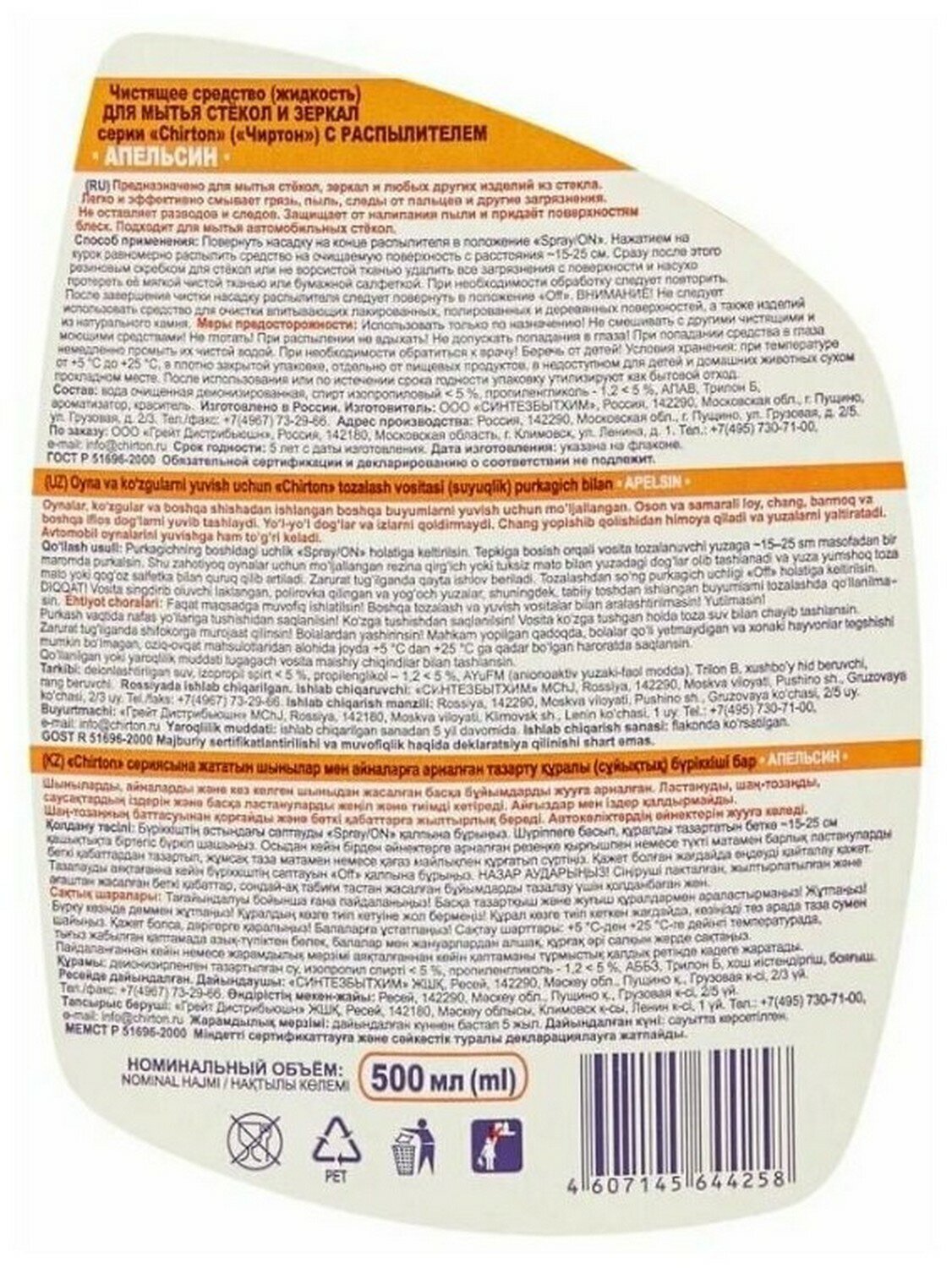 CHIRTON Средство для мытья стекол и зеркал "Апельсин", 500 мл Стеклоочиститель