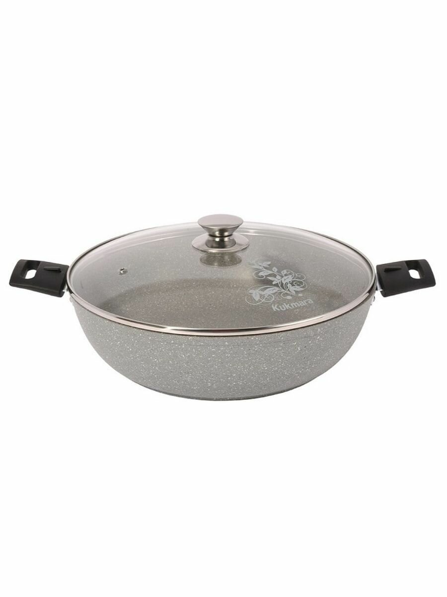 Сотейник 30 см со стеклянной крышкой, антипригарное покрытие, светлый мрамор Kukmara .