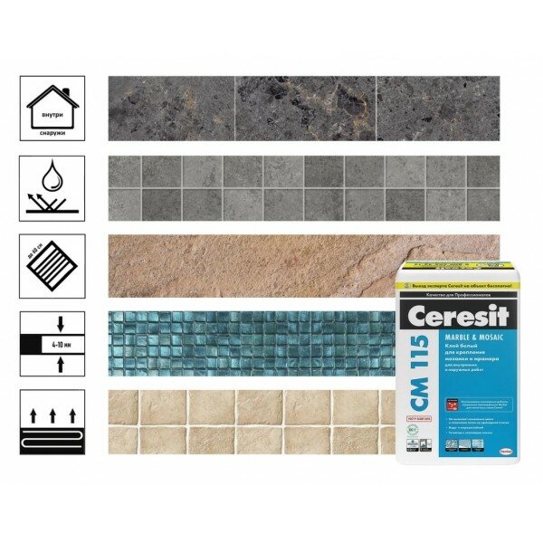 Клей для плитки и мозаики Ceresit CM 115 Marble & Mosaic белый (5кг)