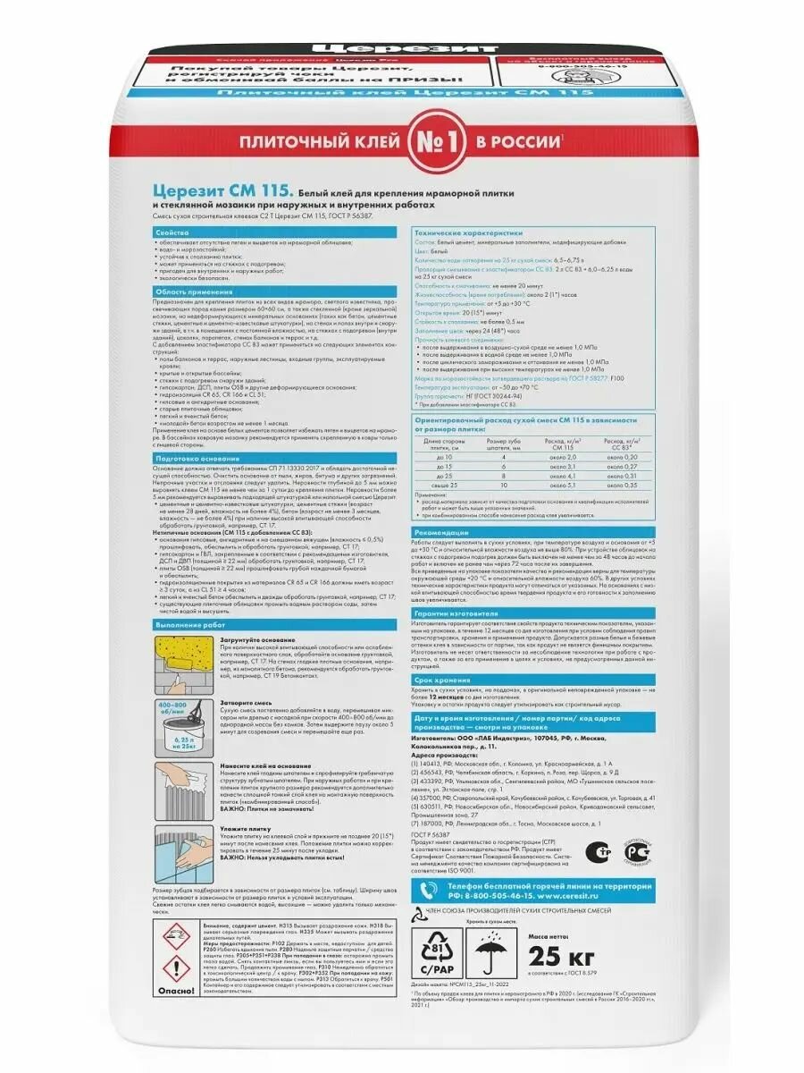 Клей СМ115 для мрам. плитки и мозаики, церезит - 25 кг.