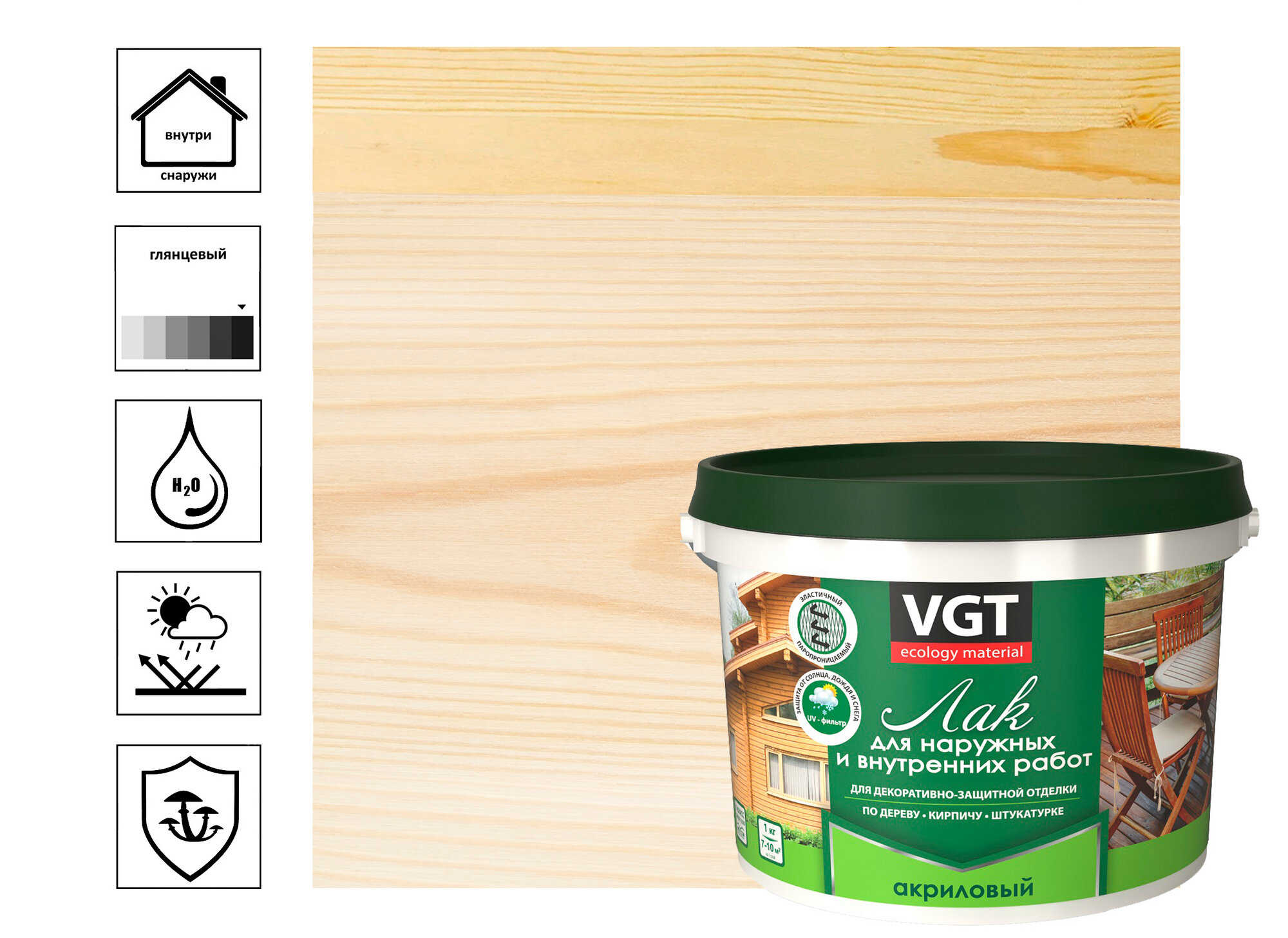ВГТ лак акриловый для наружных и внутренних работ глянцевый (0,9кг) / VGT лак акриловый для наружных и внутренних работ по дереву кирпичу штукатурке г