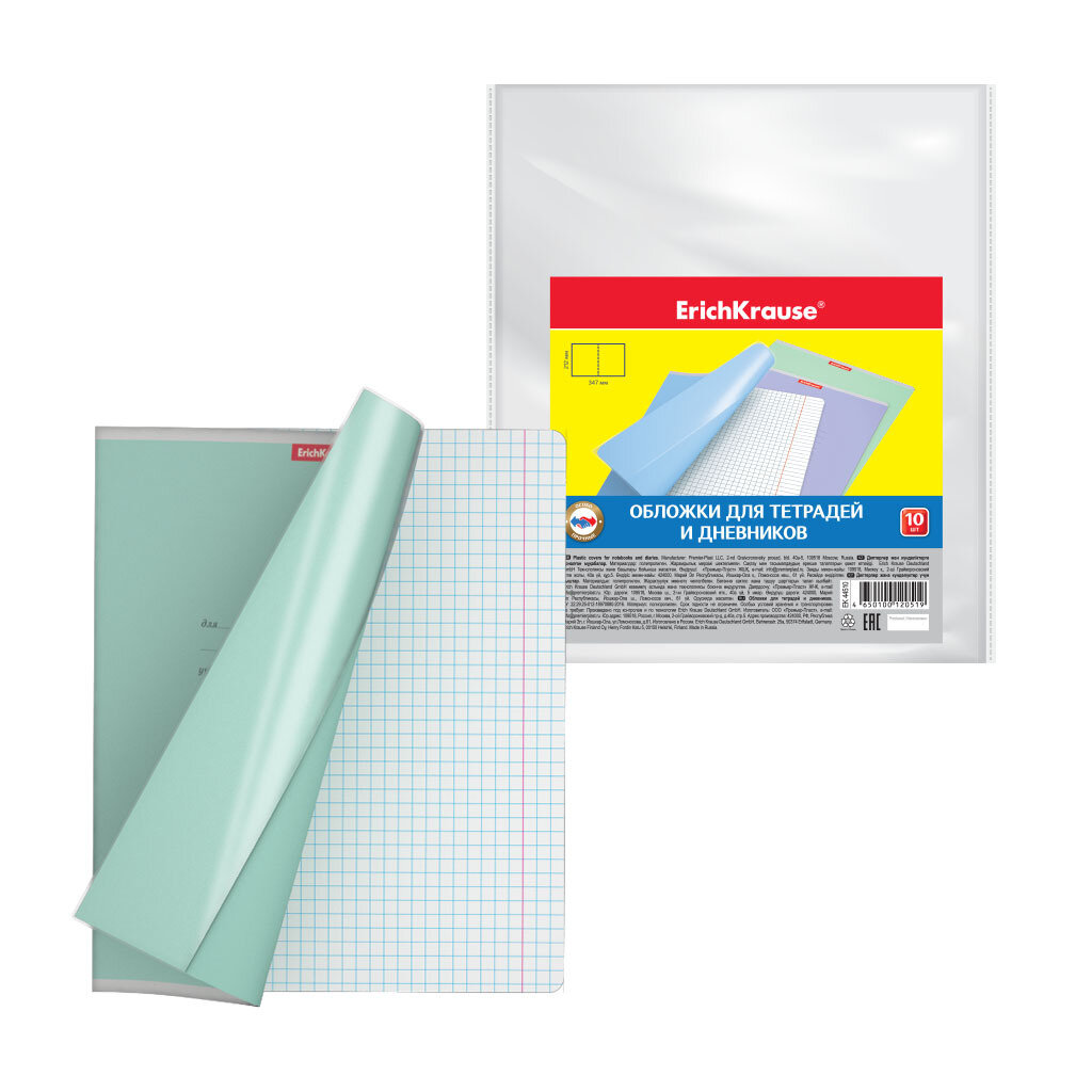 Обложки для тетради и дневника Erich Krause 10 шт, прозрачные, 50 мкм, 212х347 мм (44510)