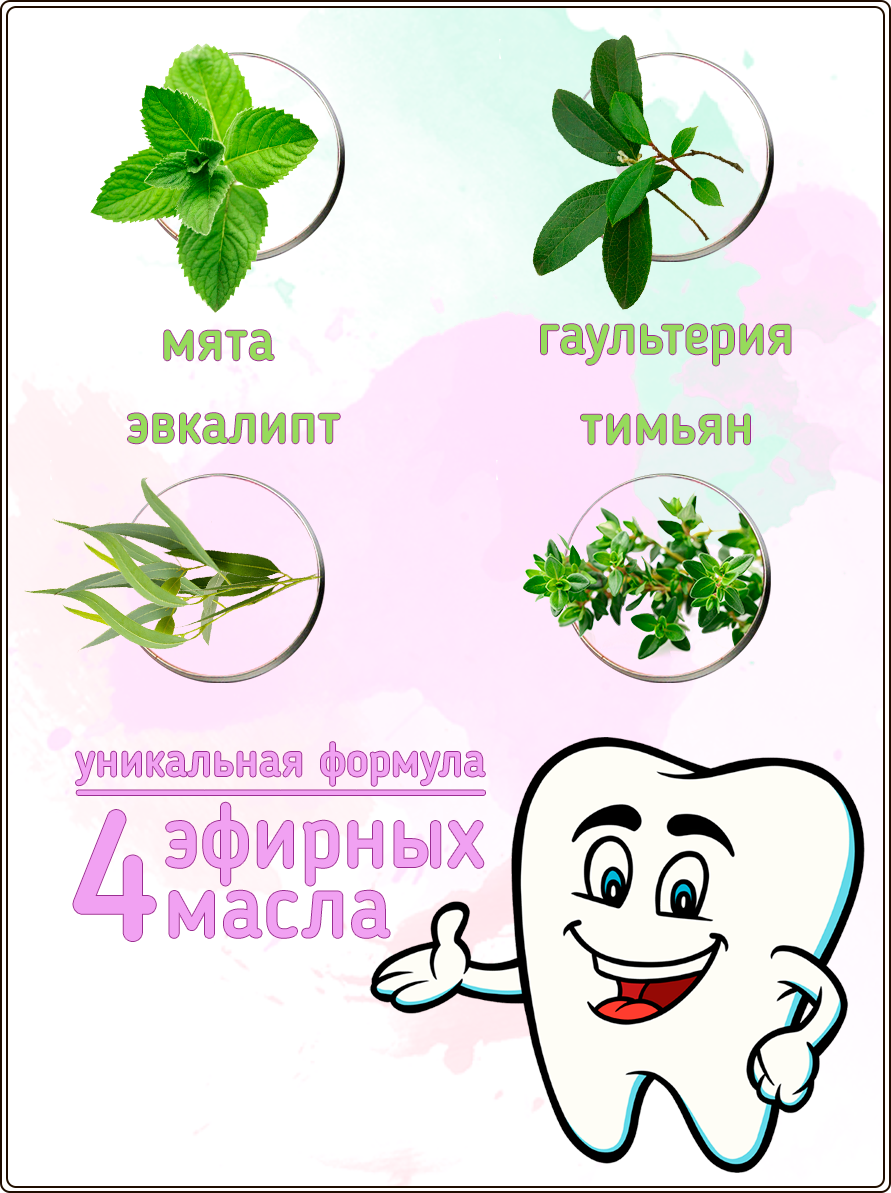| Плюсы: | Уничтожает бактерии, освежает дыхание |