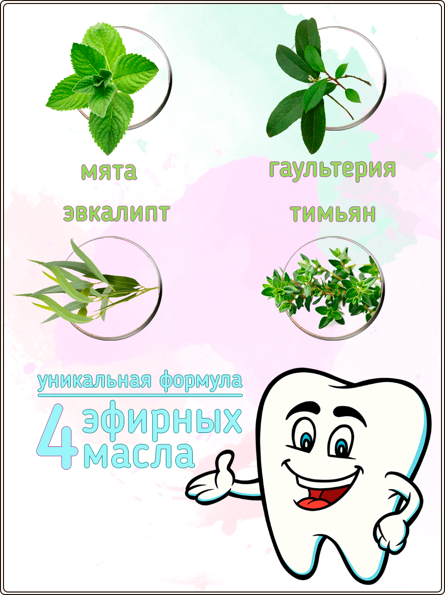 | Плюсы: | Уничтожает бактерии, освежает дыхание |