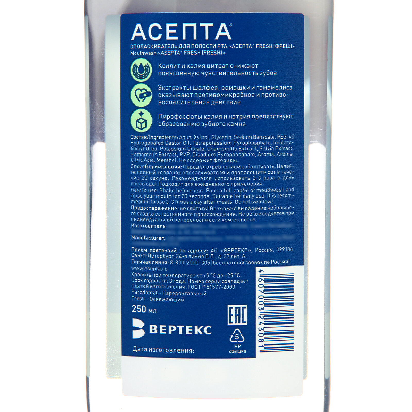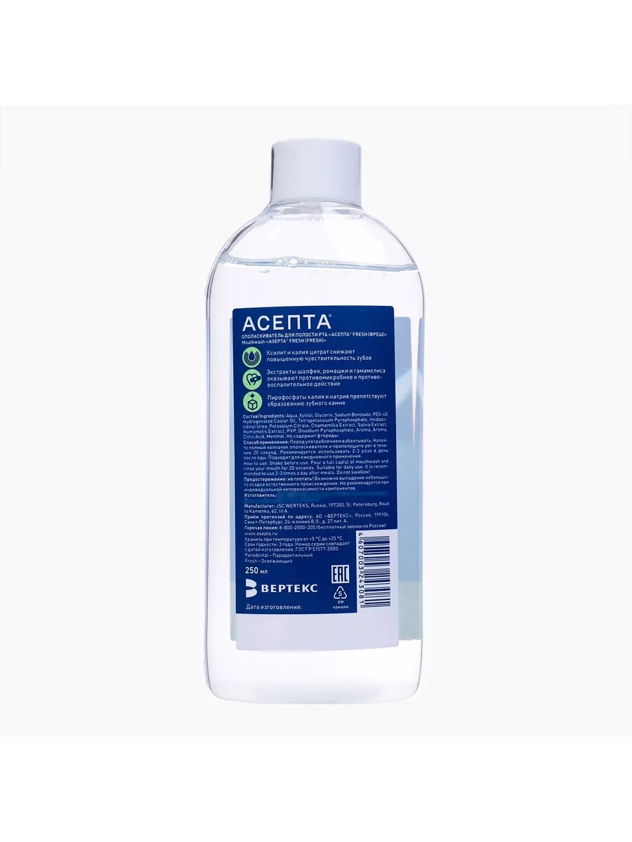 Ополаскиватель для полости рта и десен ASEPTA Fresh, для снижения чувствительности, 250 мл