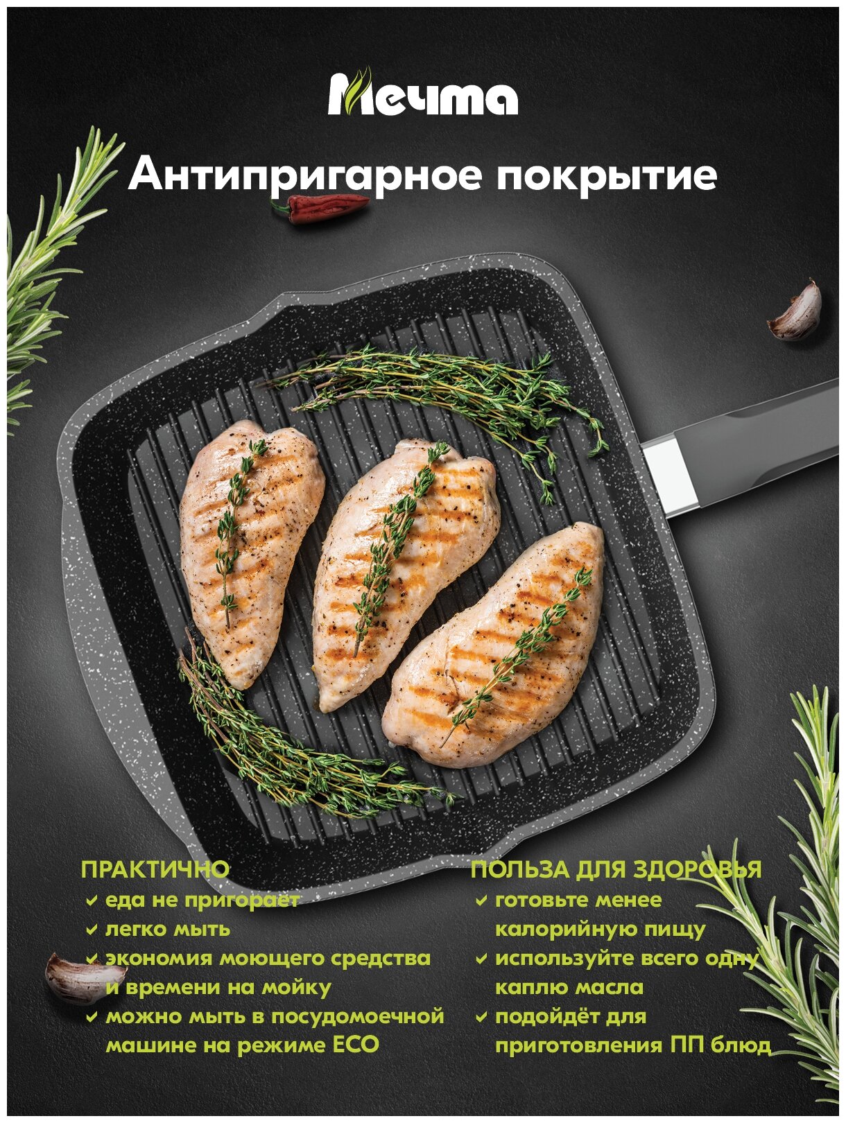 Сковорода гриль Мечта квадратная 26х26 см Гранит с антипригарным покрытием с несъемной ручкой, НЕ индукционная