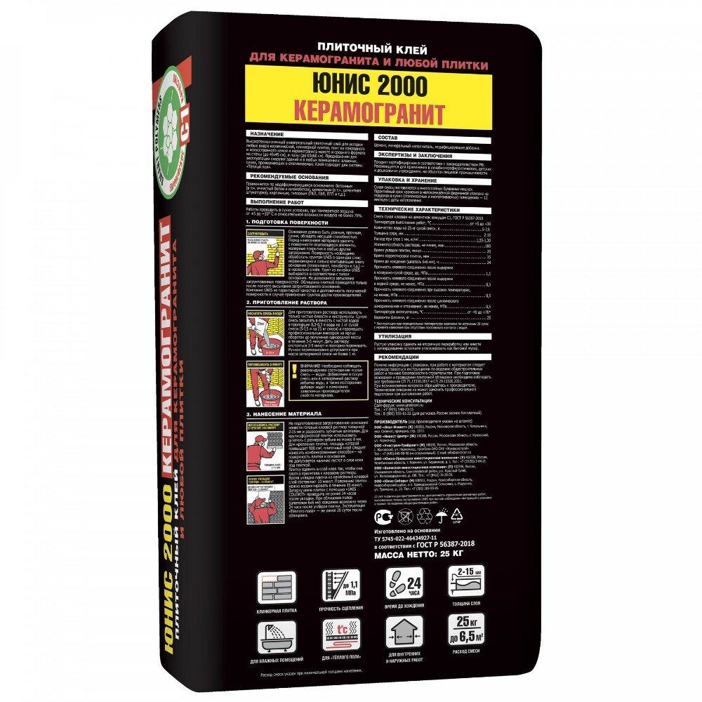 Клей Unis для плитки 2000 керамогранит 25 кг 48 черный мешок юнис (1шт) (65669)
