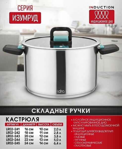 СохранитьКастрюля с крышкой LARA LR02-24 - серия изумруд, 16 см, 2л, 5-слойное капсулированное дно, складные ручки интересное:
