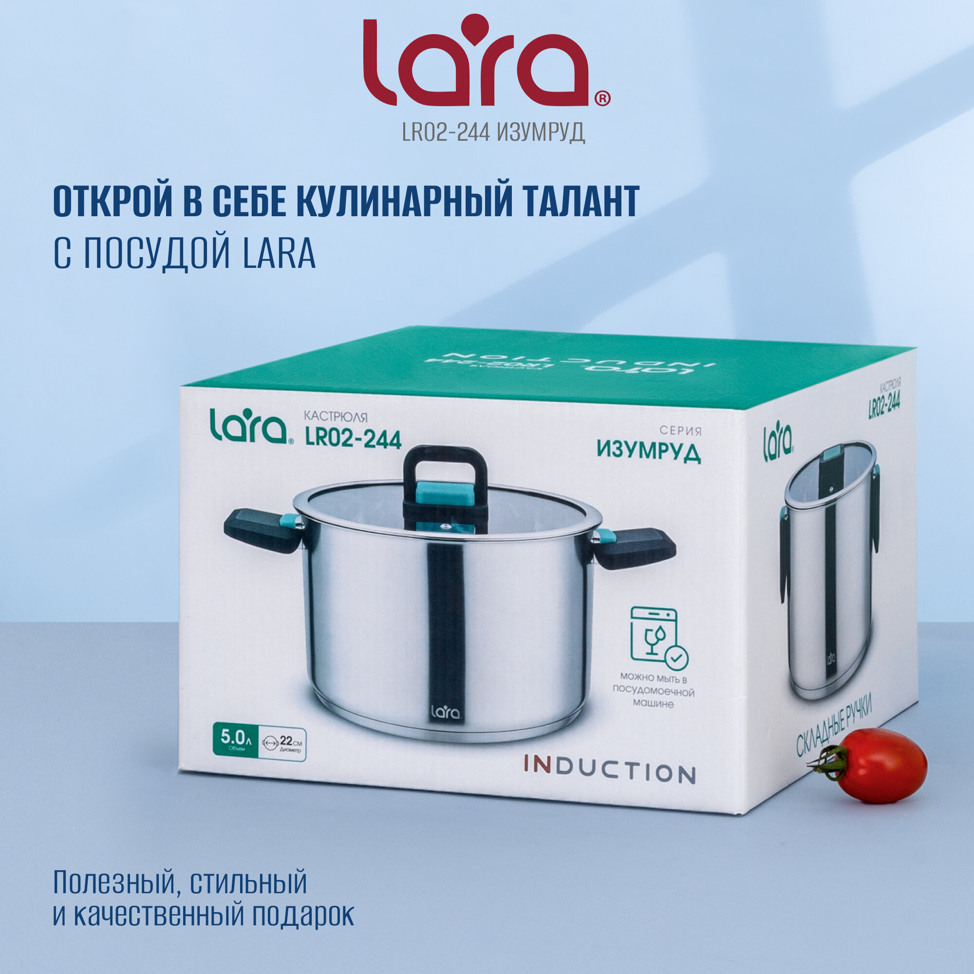 Ниже Вы можете прочитать отзывы на Кастрюля с крышкой LARA LR02-244 - серия изумруд, 22 см, 5 л, 5-слойное капсулированное дно, складные ручки, ознакомится с подробными характеристиками, посмотреть интересные обзоры и фотографии на Кастрюля с крышкой LARA LR02-244 - серия изумруд, 22 см, 5 л, 5-слойное капсулированное дно, складные ручки.