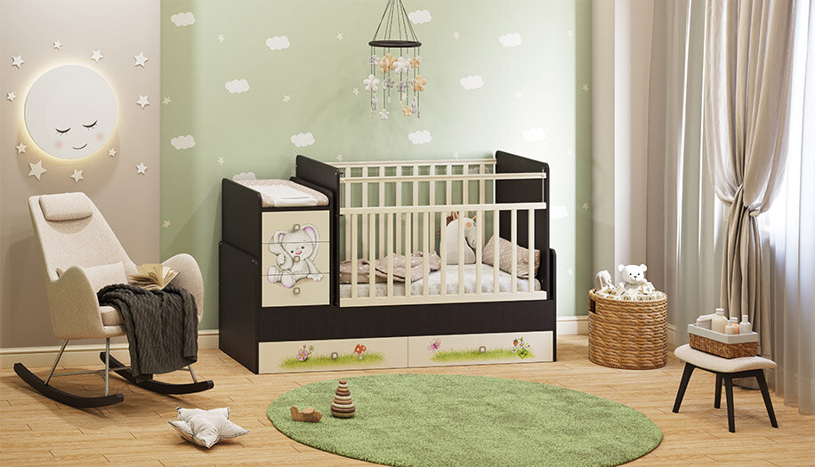 СохранитьКроватка Фея 1100 с рисунком, трансформер, поперечный маятник, зайчонок интересное: