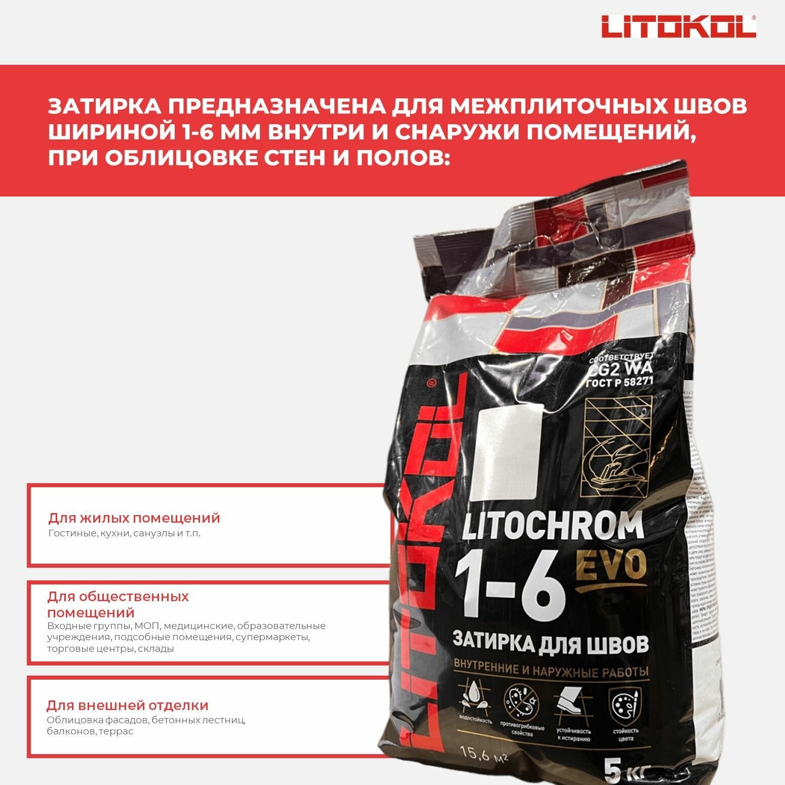 Затирочная Смесь Litokol Litochrom 1-6 Evo 5кг LE.125 Дымчатый Серый, Цементная для Затирки Швов Плитки от 1 до 6 мм / Литокол Литохром Эво.