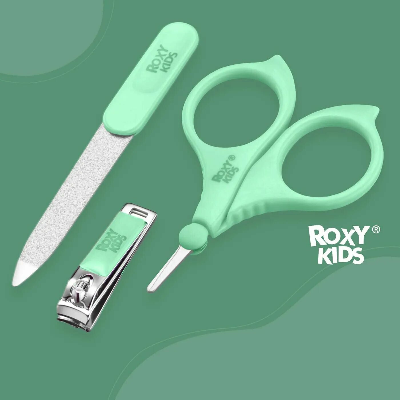 Маникюрный набор от ROXY-KIDS: ножницы, пилочка, кусачки. Цвет зеленый