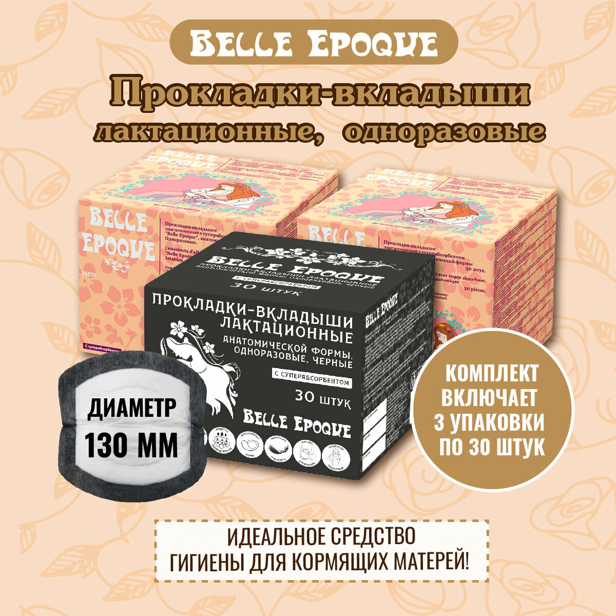 Прокладки-вкладыши лактационные одноразовые Belle Epoque с суперабсорбентом анатомической формы 90 шт. (черные 30 шт х 1уп + белые 30 шт х 2уп)