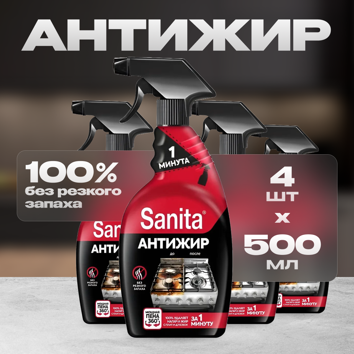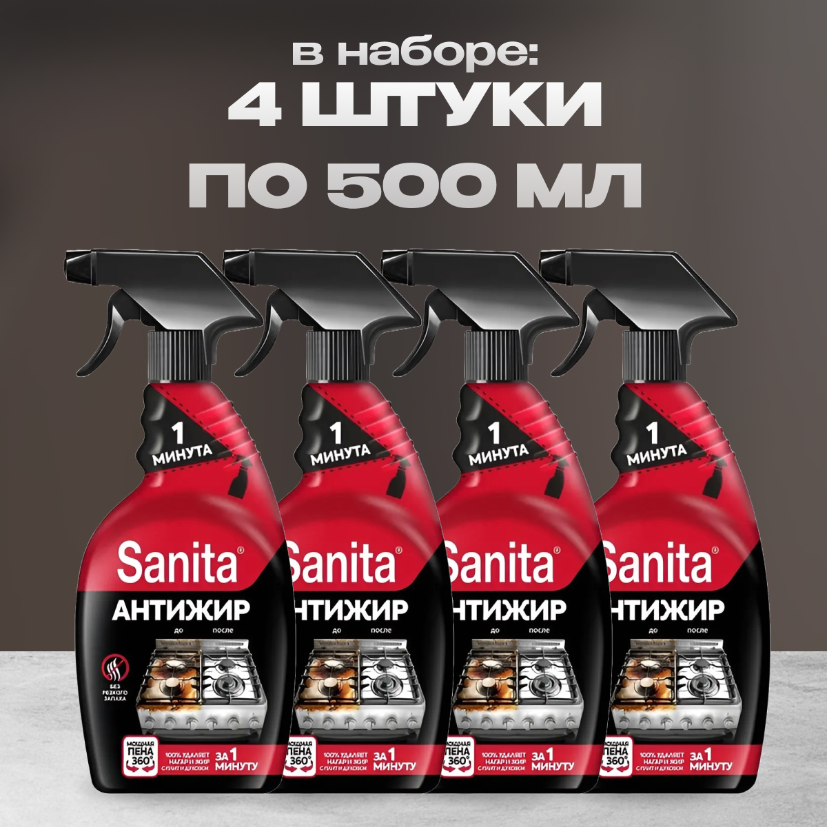 Набор чистящих средств для кухни Sanita спрей очиститель Антижир "1 минута", 500 мл (4 шт)