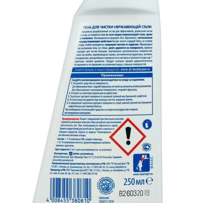 Ниже Вы можете прочитать отзывы на Dr. Beckmann Пена для чистки нержавеющей стали 250 мл, ознакомится с подробными характеристиками, посмотреть интересные обзоры и фотографии на Dr. Beckmann Пена для чистки нержавеющей стали 250 мл.