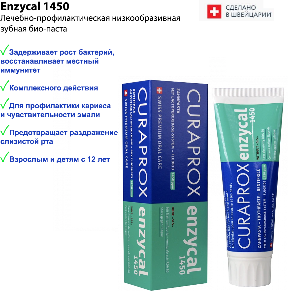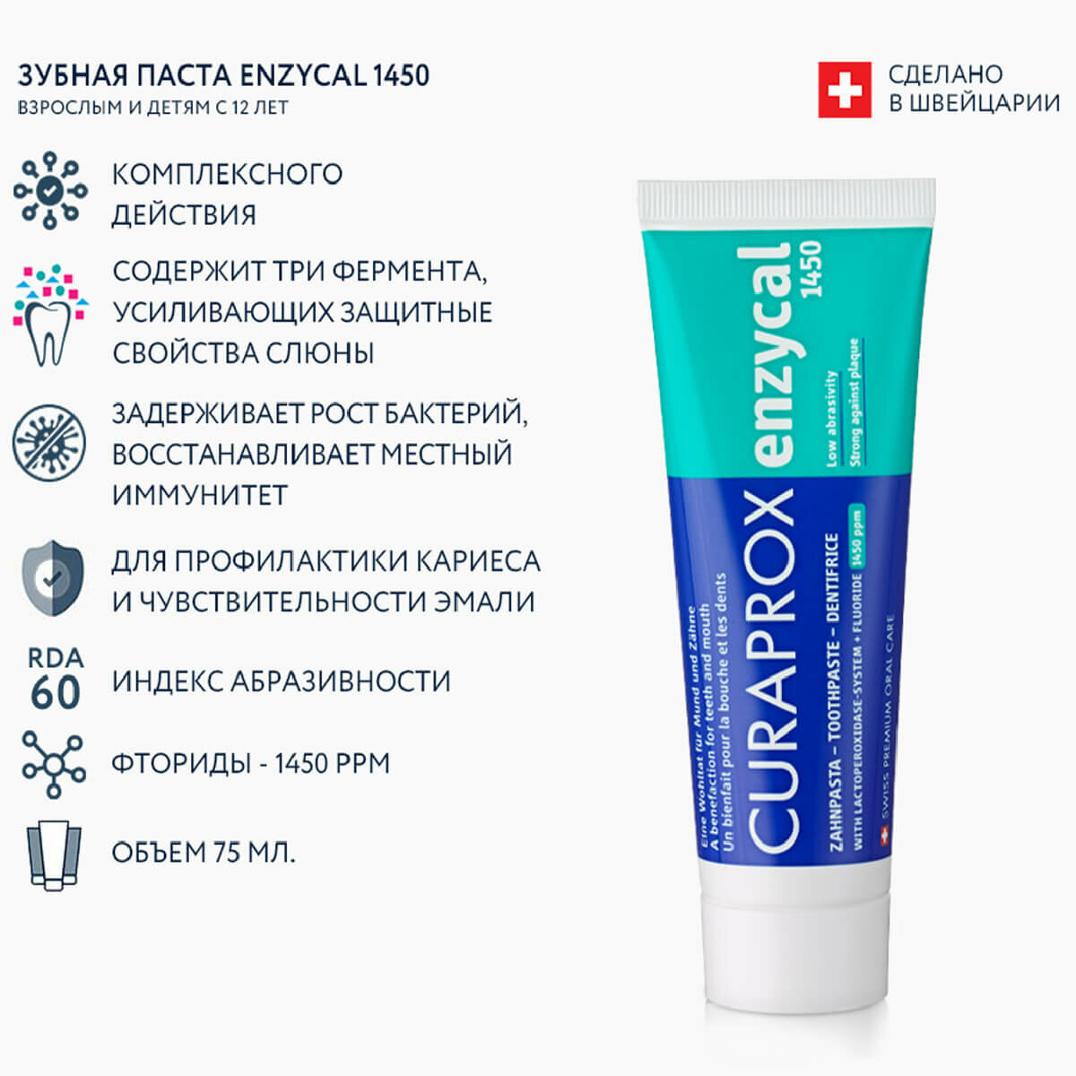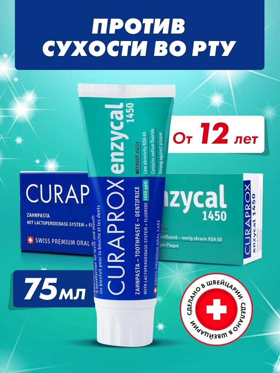 Зубная паста с фтором CURAPROX Enzycal 1450 ppm для взрослых и детей от 12 лет, ля ежедневной гигиены, без сахара 75 мл