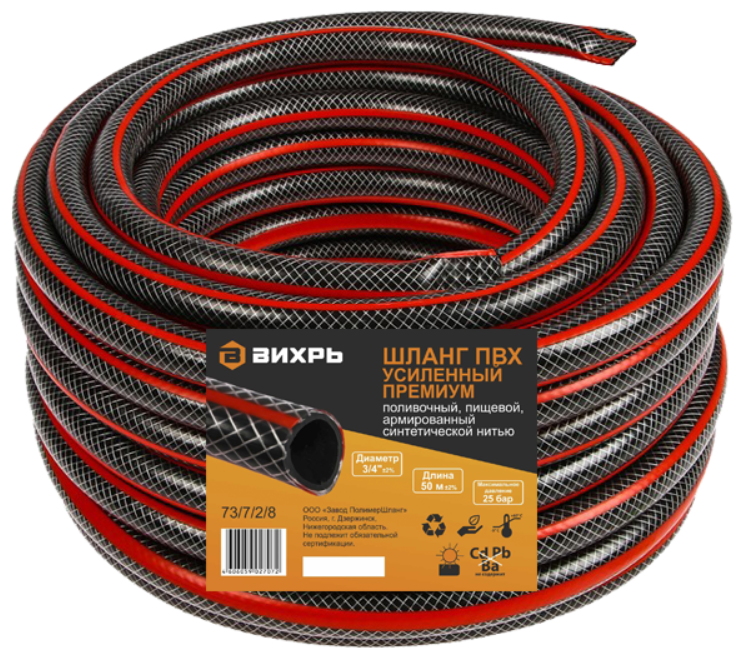 Шланг Вихрь ПВХ усиленный премиум,пищевой трехслойный армированный 3/4, 50 м (чёрн-красн) 73/7/2/8