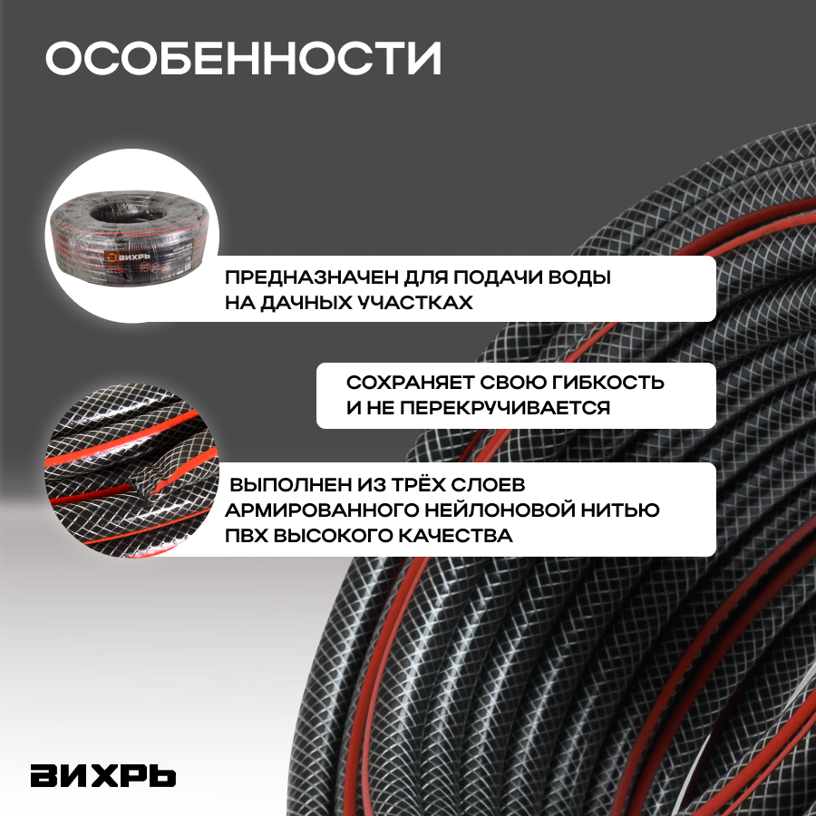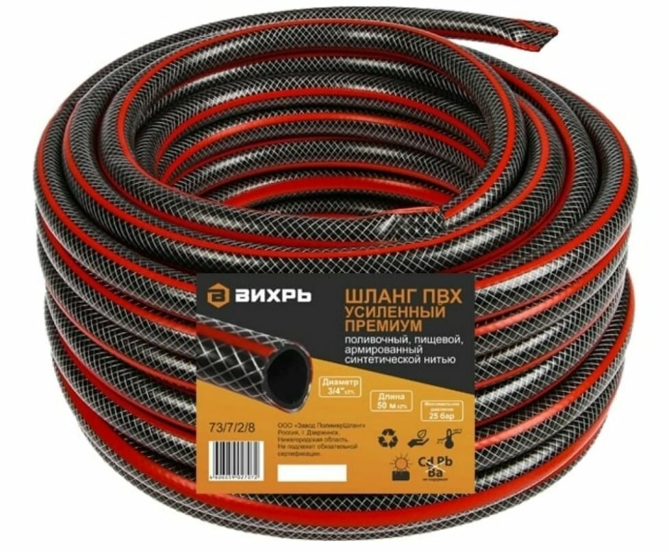 Шланг Вихрь ПВХ усиленный премиум,пищевой трехслойный армированный 3/4, 50 м (чёрн-красн) 73/7/2/8