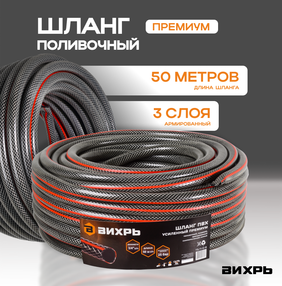 Вихрь Шланг поливочный ПВХ усиленный премиум,пищевой трехслойный армированный 3/4, 50 м 73/7/2/8 .