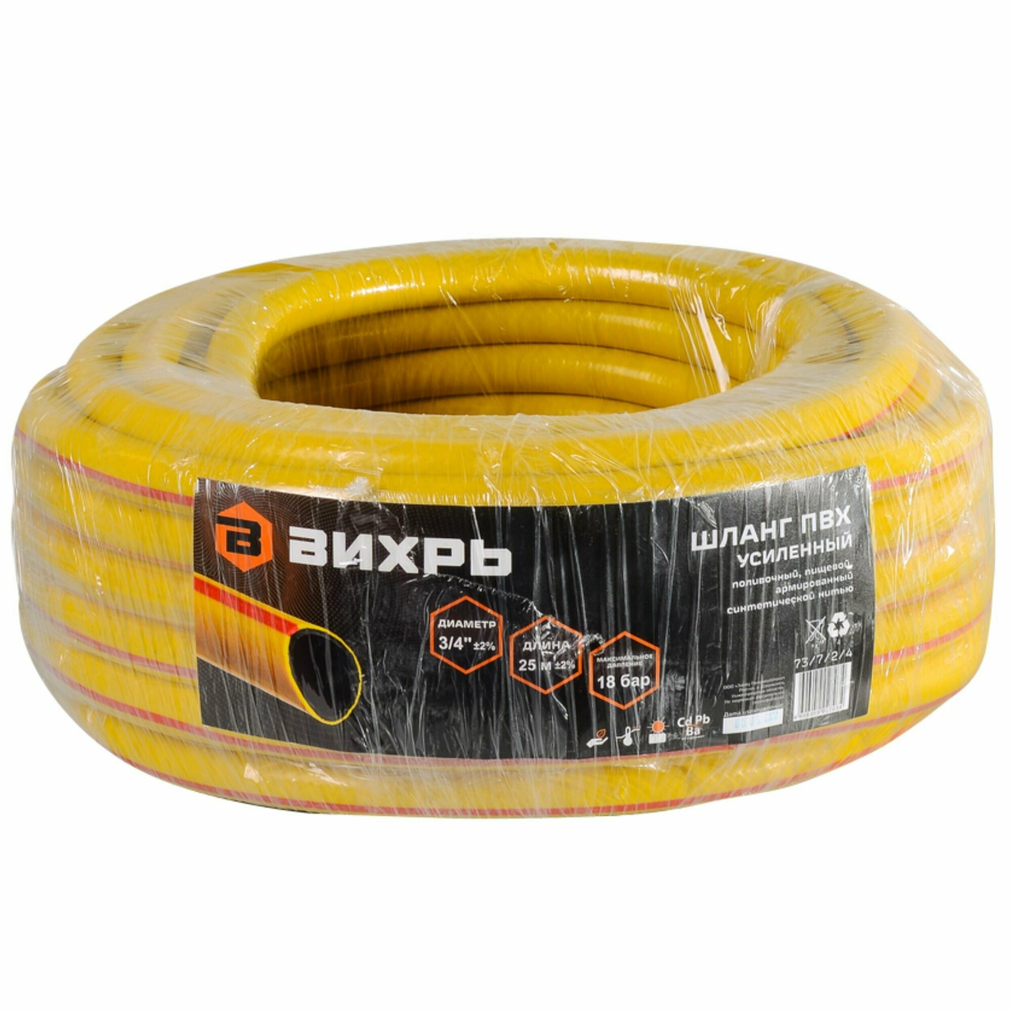 Вихрь Шланг поливочный ПВХ усиленный, пищевой трехслойный армированный 3/4, 25 м жёлтый 73/7/2/4