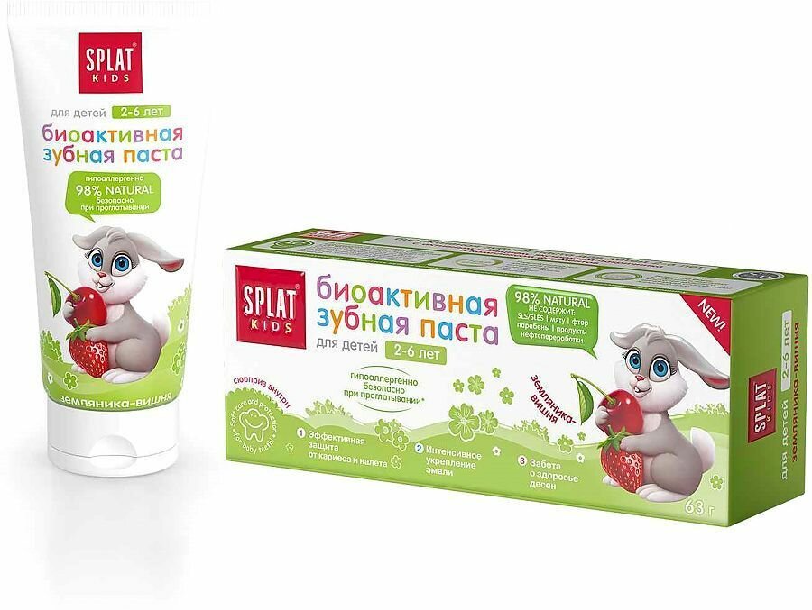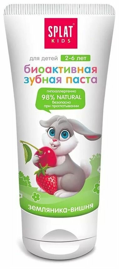 Зубная паста детская Splat Kids земляника-вишня, биоактивная, защита от кариеса, укрепление эмали и десен, от 2 до 6 лет, 50 мл