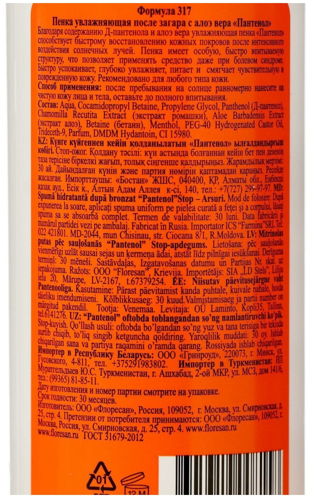 Floresan пенка увлажняющая после загара Пантенол Стоп ожог алоэ вера 150мл.