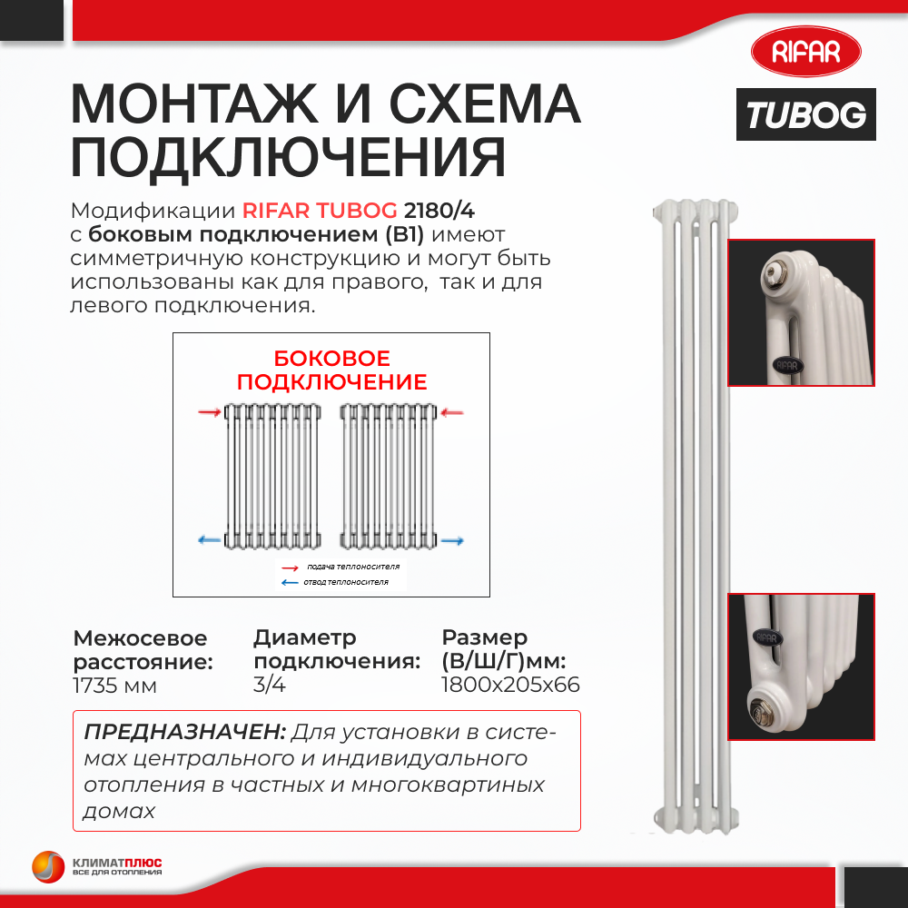 СохранитьРадиатор отопления Rifar Tubog 2180 / 4 секции, боковое подключение, вертикальный, трубчатый, цвет белый Ral 9016 интересное: