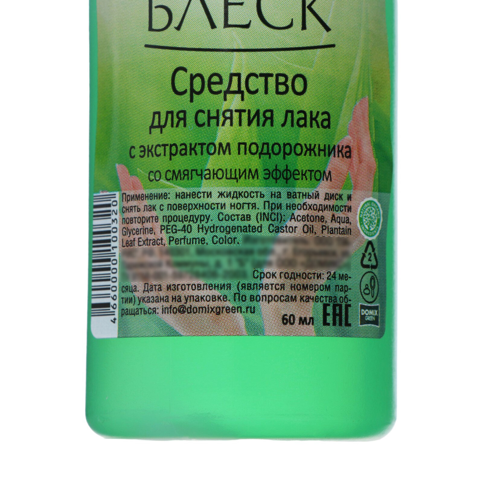 Средство для снятия лака Domix Green «Блеск», с экстрактом подорожника, 60 мл