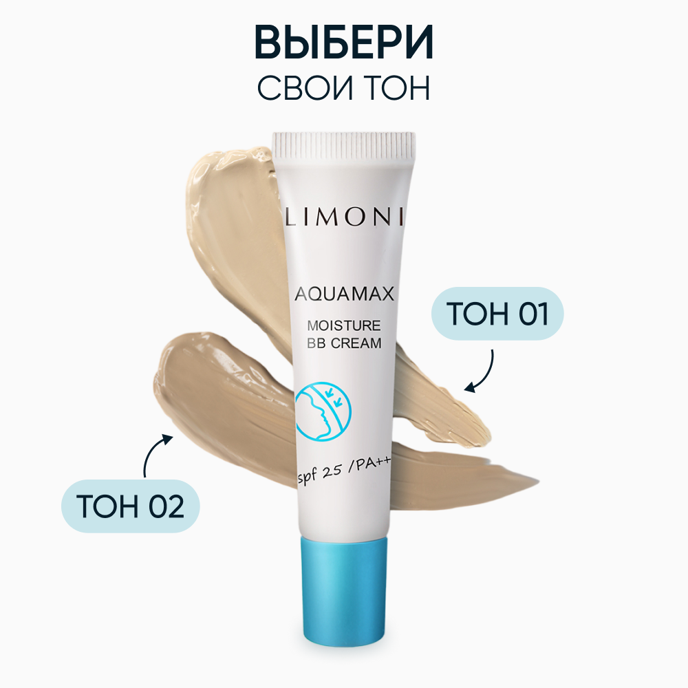 LIMONI Тональный BB крем для лица увлажняющий и выравнивающий тон кожи AQUAMAX SPF 25 PA++ тон №2, 15 мл