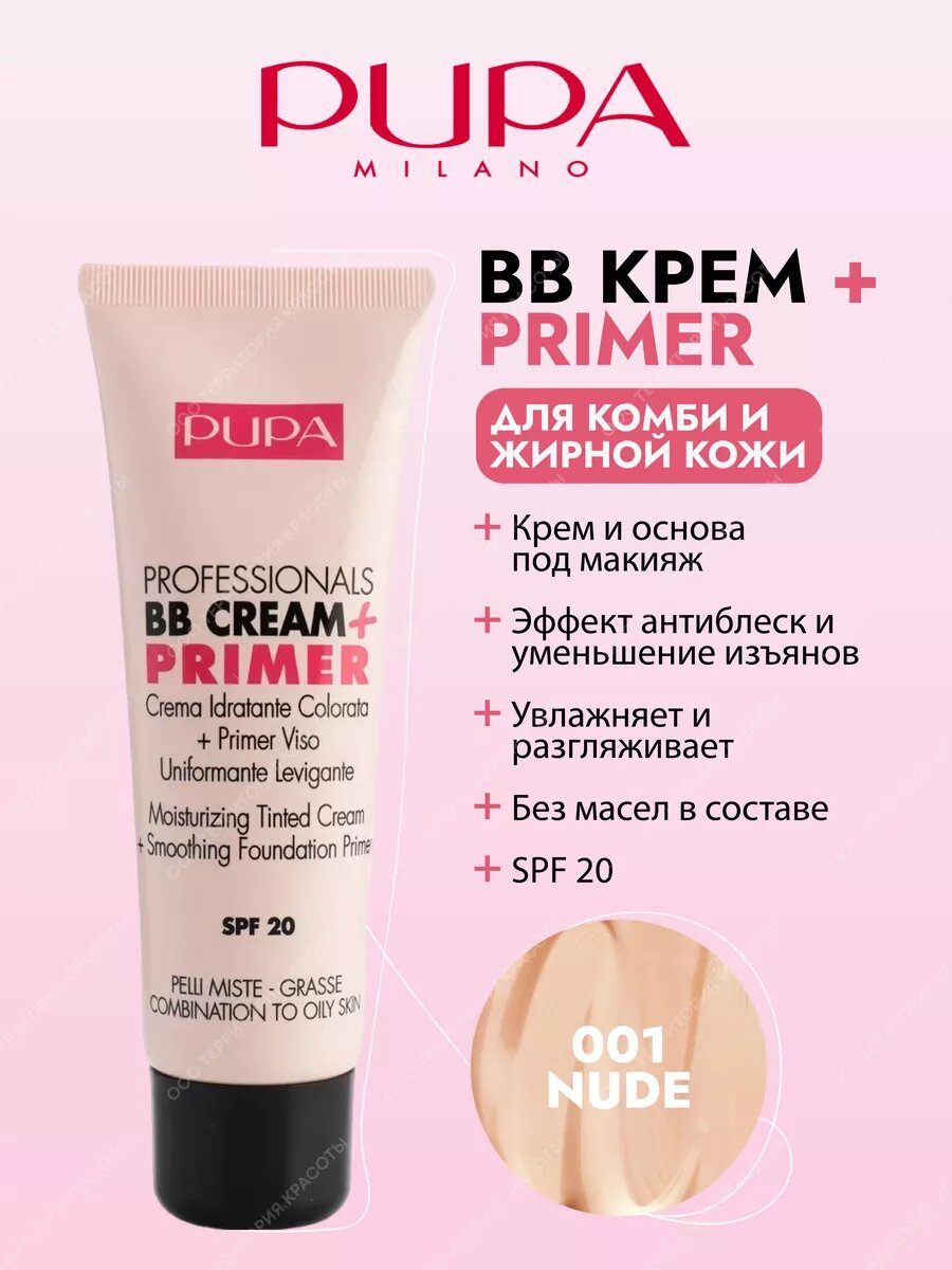 Pupa BB CREAM + PRIMER Увлажняющий крем-тон + основа под макияж с выравнивающим и разглаживающим эффектом для жирной и комбинированной кожи тон 001, Nude (натуральный) 50мл
