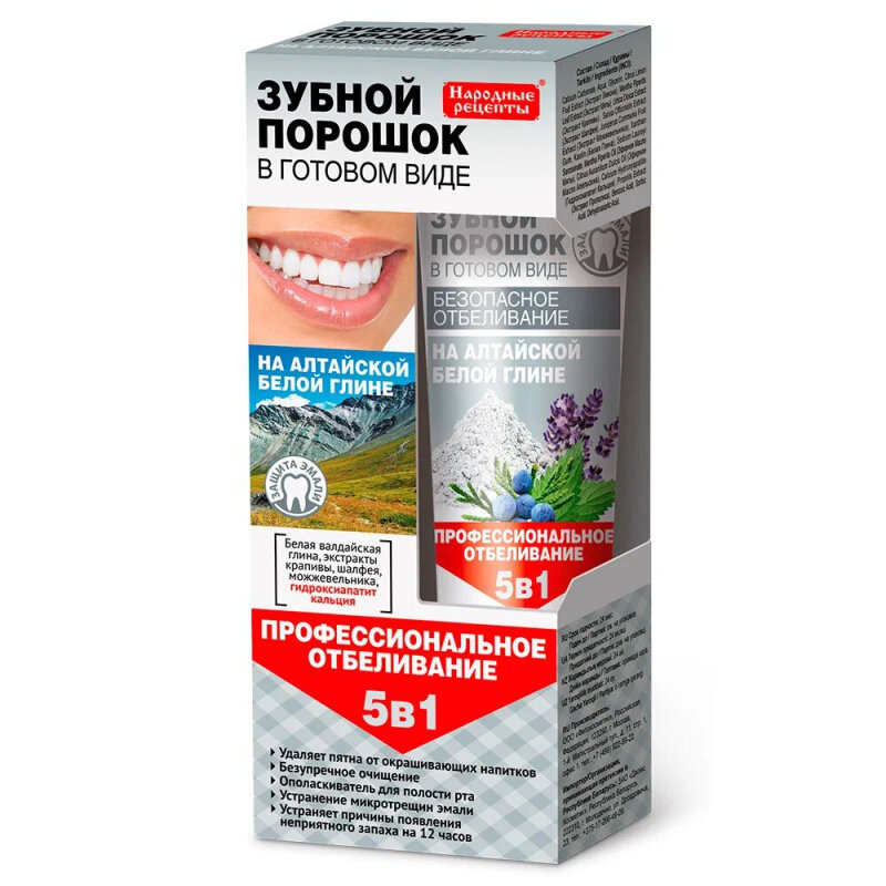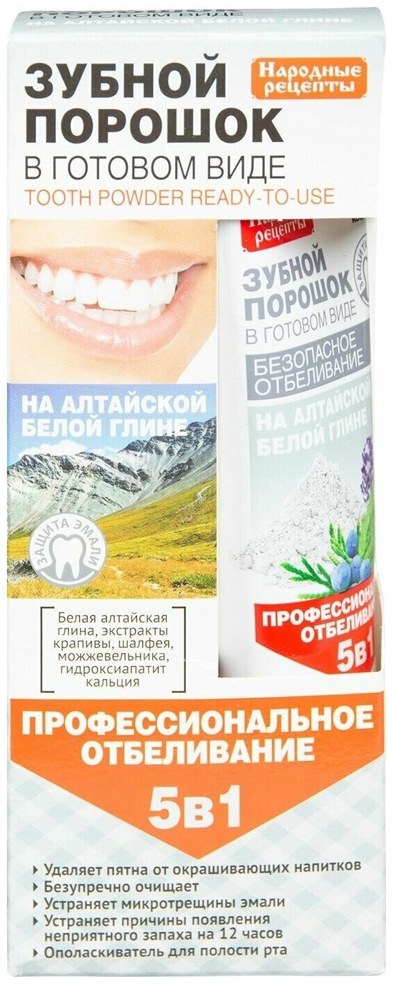 Купить Зубной порошок Народные рецепты в готовом виде Профессиональное отбеливание 5 в 1 на алтайской белой глине, 45 мл