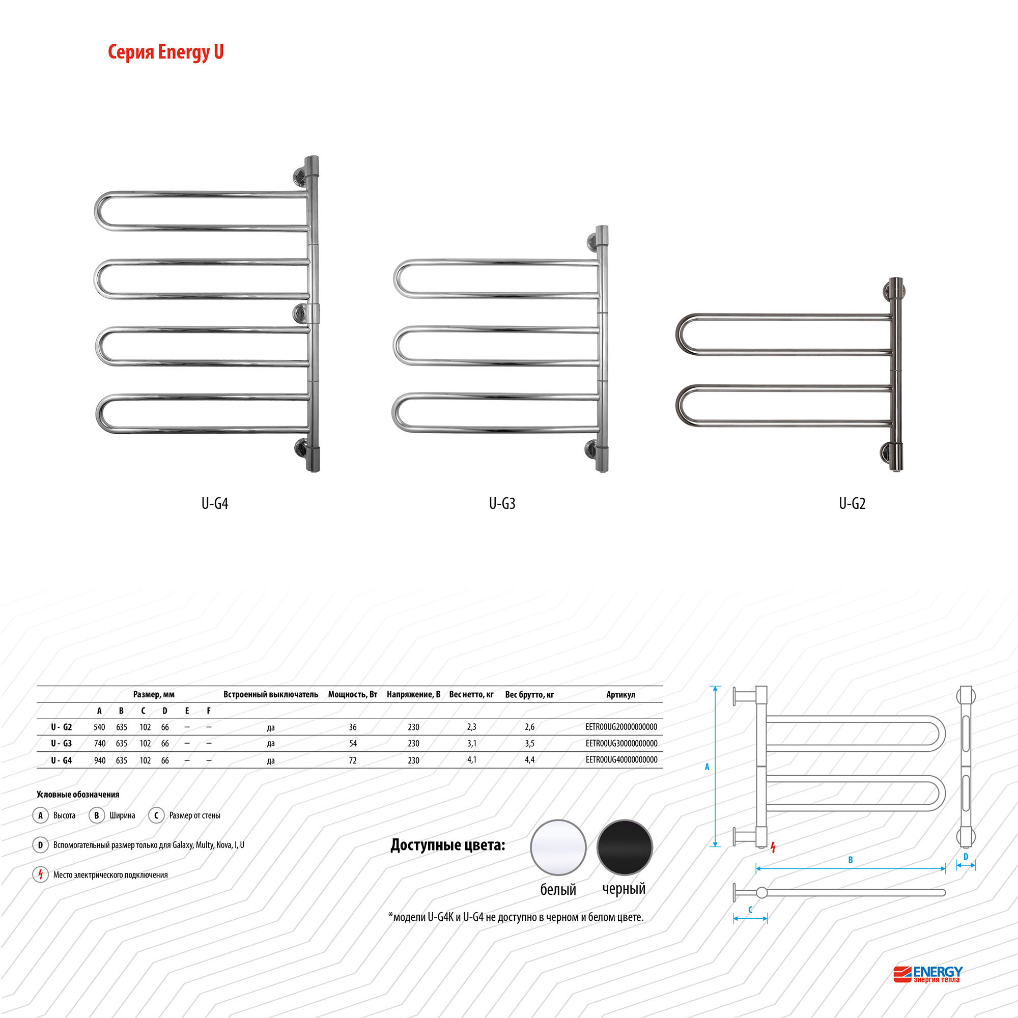 Электрический полотенцесушитель Energy U - G2K поворотный белый матовый, скрытое/наружное подключение