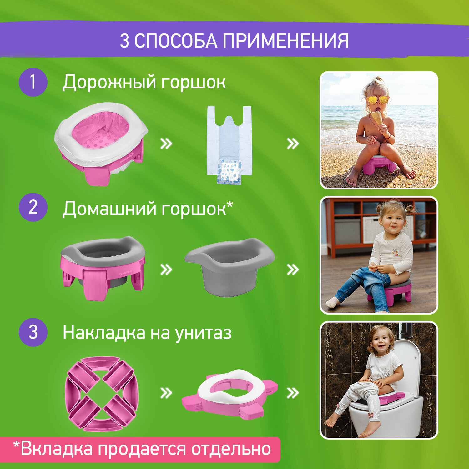Дорожный горшок и насадка на унитаз HandyPotty 3в1 от ROXY-KIDS цвет лайм