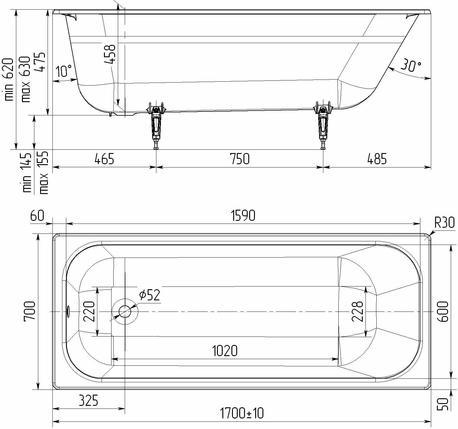 | Минусы: | Резьба на болтах регулируемых ножек не позволяет опустить ванну ниже 62 см, а часто необходимая высота под плитку 60 см. |