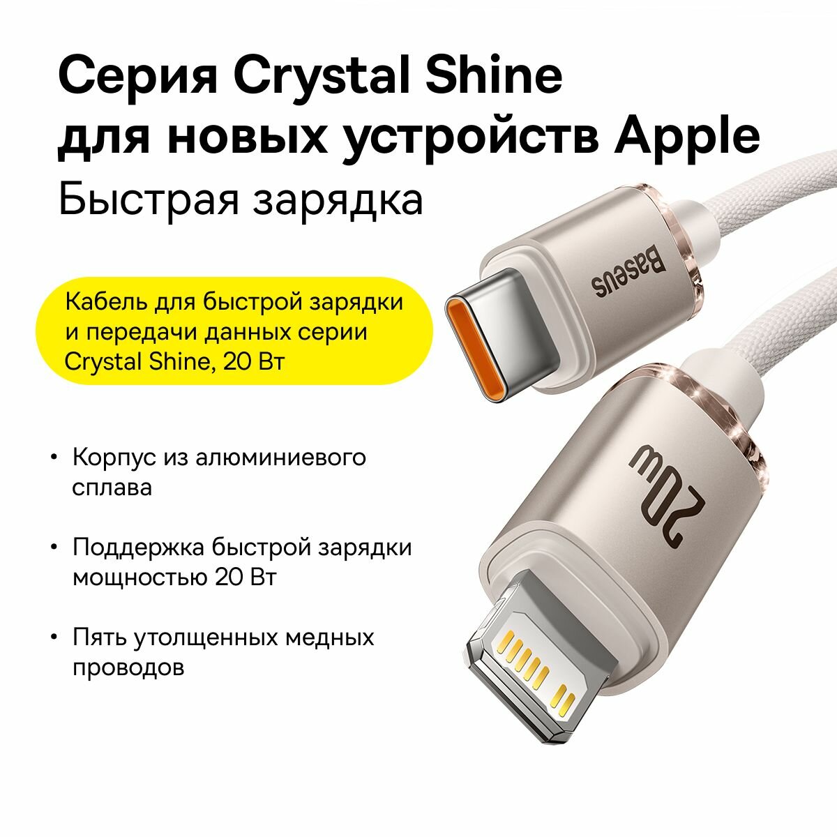 Кабель Baseus Crystal Shine Series Fast Charging Data Cable, Type-C - Lightning , 20W, 1.2 м , Нежно-фиолетовый
