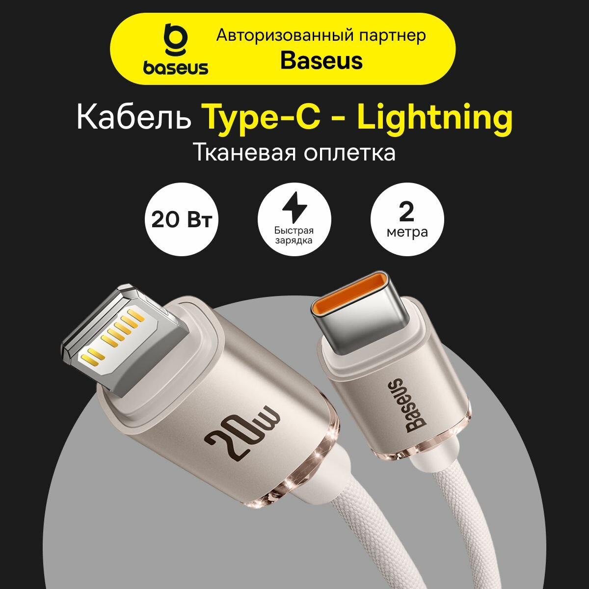 Дата-кабель Baseus CATLGD-A02, Type-C To Lightning, 2m, 20W, белый