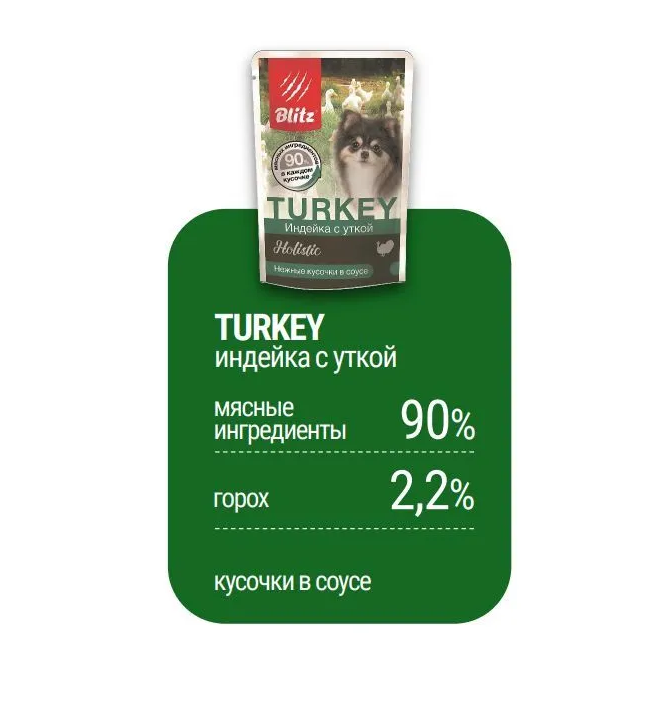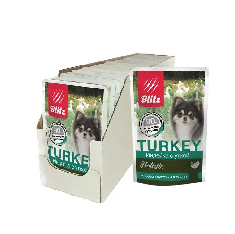 BLITZ Holistic Turkey влажный корм для собак мелких пород с индейкой и уткой, кусочки в соусе (85 гр*24 шт)