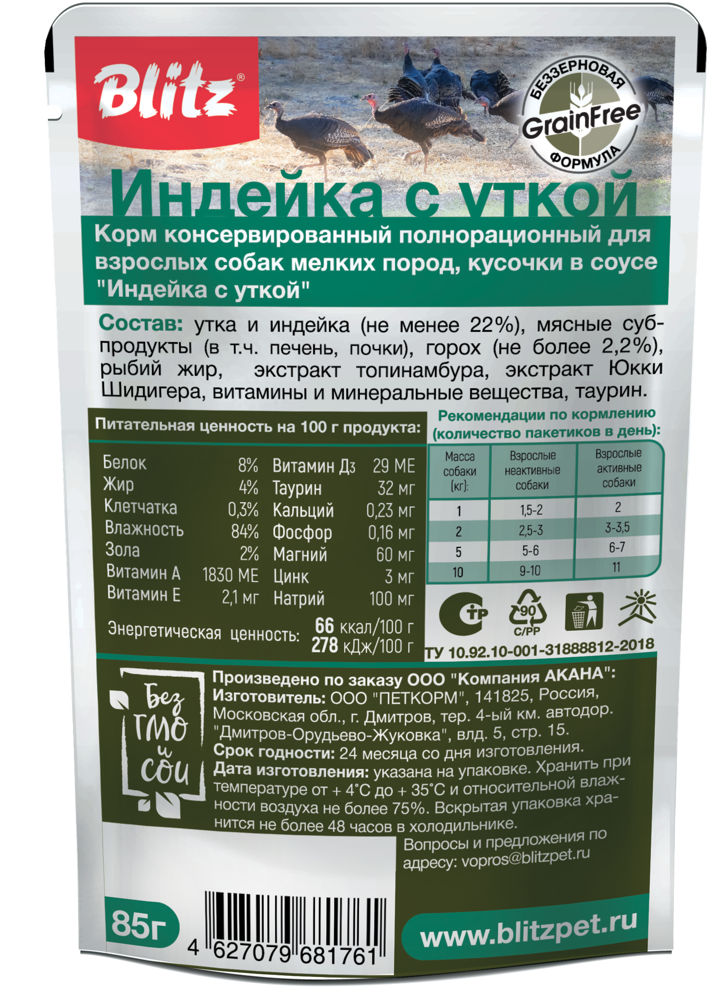 Купить Блитц пауч д/собак мелких пород TURKEY Индейка/Утка в соусе 85 г 24 шт
