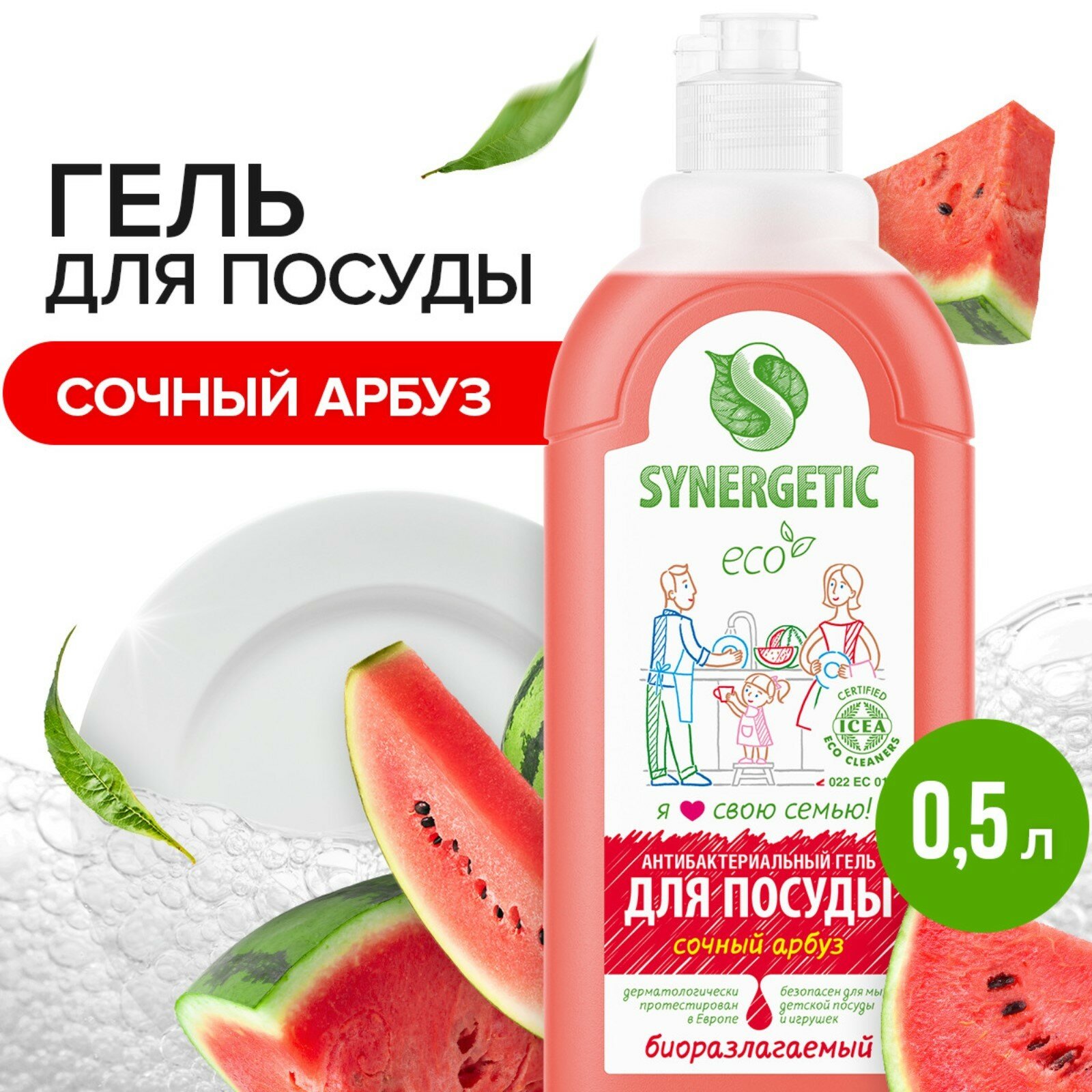 Гель для мытья посуды SYNERGETIC Арбуз, биоразлагаемый 0,5л