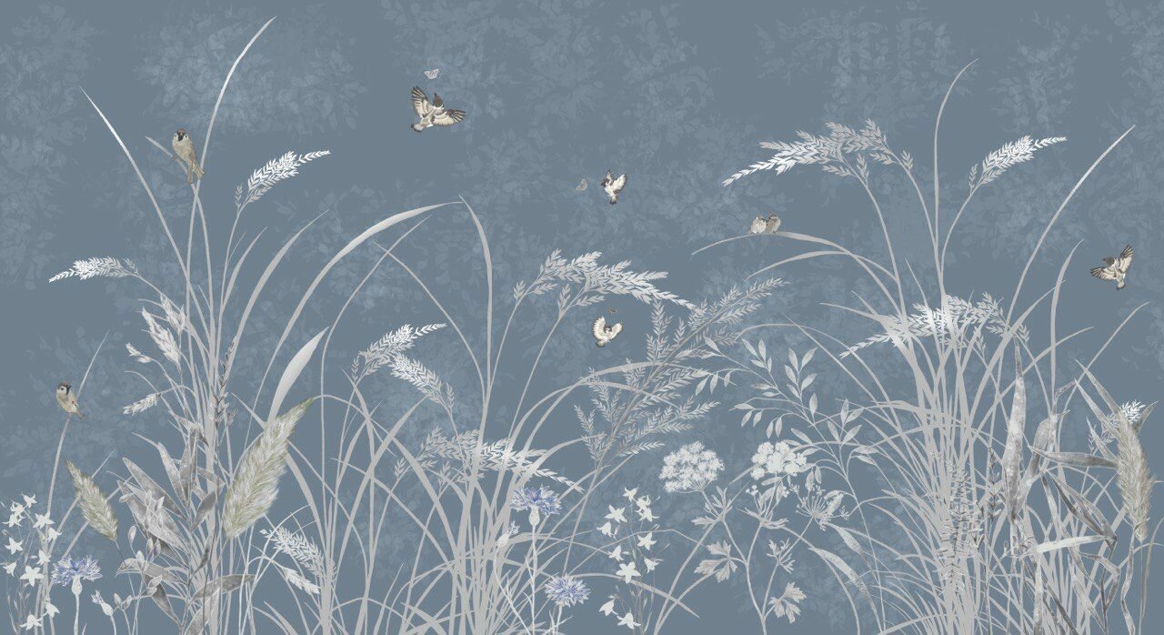 Фреска бесшовная Летний сад воробьи серо-голубые текстура листья (ширина 2750мм х длина 3000мм)