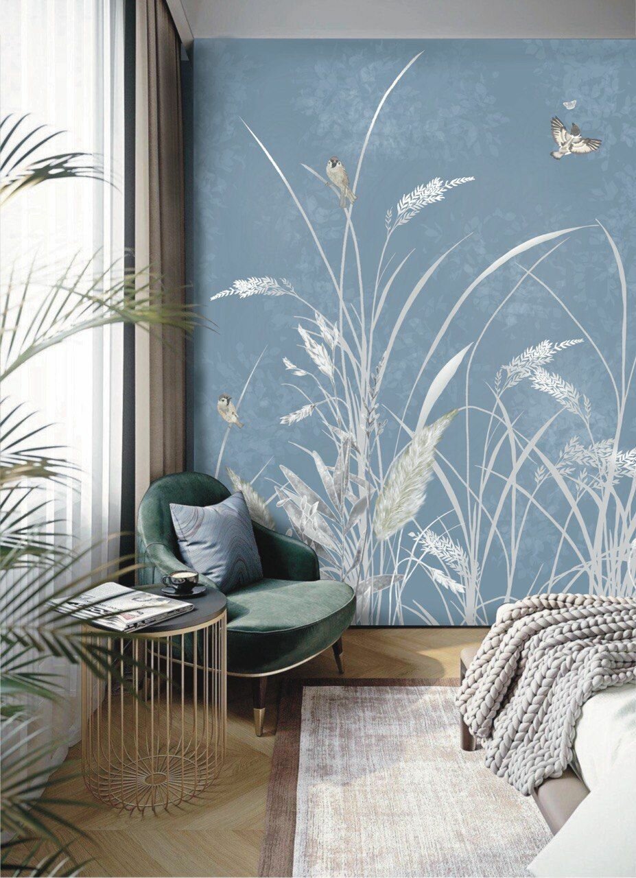 Фреска бесшовная Летний сад воробьи синий текстура листья (ширина 2750мм х длина 3000мм)