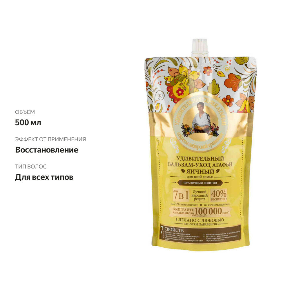 Шампунь для волос Удивительная Серия Агафьи Яичный, 7 свойств, дой пак, 500 мл Рецепты бабушки Ага .